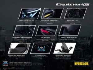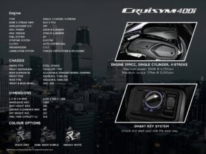 Jika anda mencari motosikal skuter yang lebih daripada sekadar pengangkutan bandar, sesuatu yang cukup bergaya, selesa dan berkuasa. SYM Cruisym 400i ialah jawapannya. Direka untuk mereka yang mahu tunggangan selesa dalam perjalanan jauh dan tetap praktikal di kota, Cruisym 400i mempersembahkan gabungan teknologi terkini dan spesifikasi tinggi.